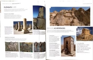 Par exemple, dans le chapitre consacré aux Achéménides, la page d’introduction montre que cet immense empire a assimilé des styles architecturaux et décoratifs des peuples incorporés (babylonien, assyrien, égyptien, grec). Une photographie montre le relief taillé dans la roche de la falaise de Bisotun sur lequel on voit Darius Ier accompagné de deux serviteurs s’adressant à différents peuples conquis. L’inscription en trois langues (élamite, vieux persan et babylonien) raconte les batailles menées par le roi.