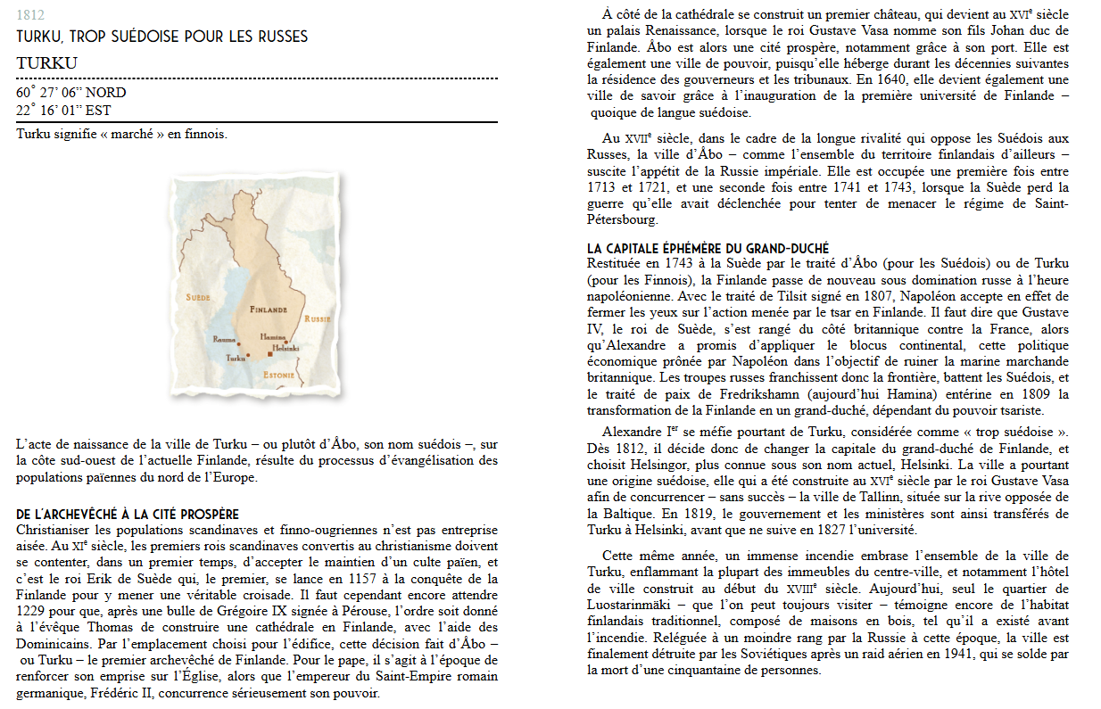Chaque déplacement est présenté par un texte de deux pages, une carte généralement à l’échelle locale, un encart sur une anecdote et un rappel de l’étymologie du lieu (quand c’est possible). Parmi les nombreux exemples évoqués, ceux de Karachi au Pakistan, de Punakha au Bhoutan, de Iasi en Roumanie, de Colombo au Sri Lanka et de Fort-de-Possel en Centrafrique sont particulièrement originaux et éclairant sur les logiques géographiques qui ont justifié, pour leurs auteurs, un déplacement.