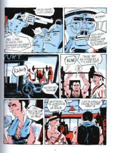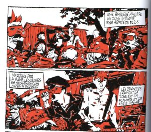 Le dessin, au trait nerveux et expressif, sert parfaitement le récit. Les couleurs – bleu, blanc, rouge et noir – ne sont pas qu’un clin d’œil au drapeau national : elles soulignent les fractures sociales, les violences physiques et symboliques qui traversent chaque page. Le bleu des bleus de travail, le rouge des drapeaux et du sang, le blanc des chemises des flics et des banderoles, le noir des nuits de révolte et des idéologies mortifères. Lionel Chouin joue avec ces contrastes pour créer une tension visuelle permanente, où chaque case semble vibrer de colère et de désespoir.