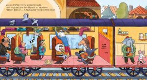 Les illustrations très colorées sont réalisées à la tablette graphique. L’enfant entre dans la gare via une petite fenêtre puis parcourt les différents wagons du train déjà bien bondé. Les nombreux voyageurs sont déjà en train de s’installer, de manger au wagon-restaurant ou de s’endormir dans le wagon-couchettes.