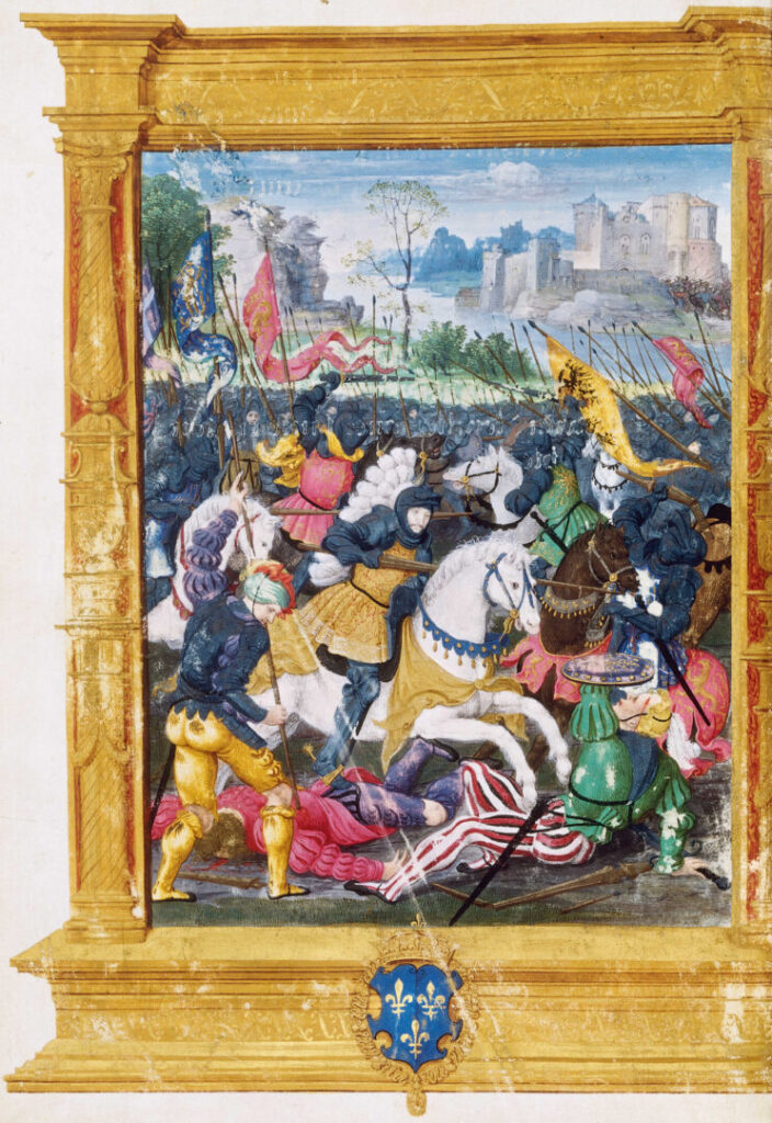 Le roi chargeant contre les Suisses à Marignan, miniature sur vélin, attribué à Noël Bellemare, dans les Oraisons de Cicéron, traduction par Étienne Le Blanc, vers 1529 – 1530, BnF, département des Manuscrits Français