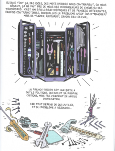 La dernière page de cette bande dessinée, à la fois synthétique et programmatique, concentre et éclaire les intentions de l’ouvrage. Il apparaît judicieux de la citer in extenso en préambule, tant elle en résume l’ambition et la portée : « Cette bande dessinée en forme d’essai graphique n’est pas une adaptation illustrée du livre intitulé French Theory : Foucault, Derrida, Deleuze et Cie et les mutations de la vie intellectuelle aux États-Unis, mais plutôt une double tentative : voir si le dessin pourrait rendre plus accessibles et plus utilisables les concepts de philosophes pas toujours faciles (c’est le côté pratique théorique), et voir si ces concepts et leur histoire mouvementée, au moment où ils sont attaqués de toutes parts, pourraient aider à résister aux fascismes qui montent (c’est le côté arme de tête) – à commencer par la vague fascisante qui menace l’Europe et vient de submerger les États-Unis, un pays qui n’est plus le même que celui qui accueillait, hier, la French Theory. » (p. 214)