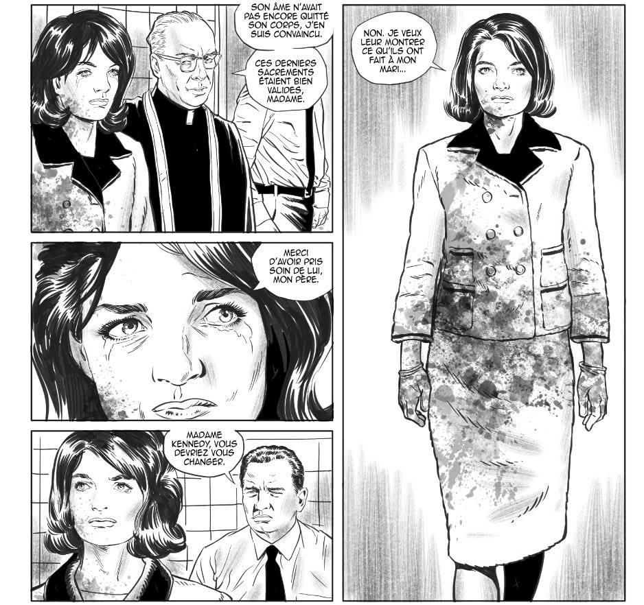 Le trait réaliste et épuré de Bernard Khattou, sublimé par un noir et blanc d’une élégance saisissante, accentue la dimension tragique de l’histoire. La mise en page, méticuleuse, et le découpage, parfaitement maîtrisé, soutiennent avec brio le rythme haletant du scénario. Quant à la couverture, dominée par les couleurs du drapeau américain et les visages de nombreux membres de la dynastie Kennedy, elle donne immédiatement le ton du récit : entre grandeur et désillusion.