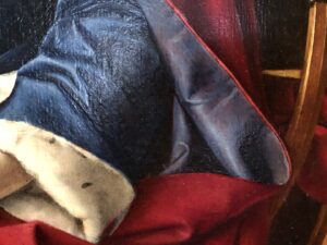 Le rendu soyeux du revers du manteau de la Vierge s’obtient par la superposition de hachures réalisées au pinceau avec des glacis de laque rouge sur la couche de lapis-lazuli.