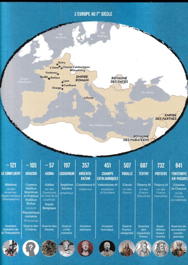 Vincent BERNARD propose de s’intéresser de plus près à cinquante batailles emblématiques de l’Histoire de France : dix batailles de l’Antiquité jusqu’au Regnum Francorum (IIe siècle avant J.-C. – IXe siècle après J.-C.) ; dix batailles du Regnum Francorum au Regnum Franciae (Xe – XVe siècles) ; dix batailles de l’époque moderne (XVIe – XVIIIe siècles) ; dix batailles du XIXe siècle et dix batailles du XXe siècle.