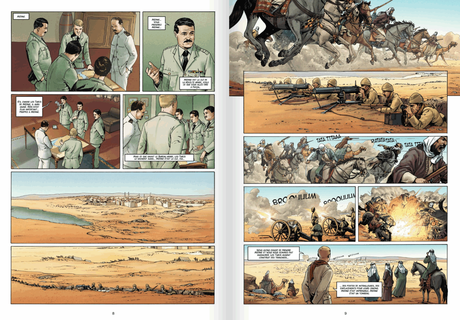 Cette bande dessinée suit un cheminement classique. Parsemé de citations issues des « Sept piliers de la sagesse » (1926), les vignettes retracent l’arrivée de Lawrence en Arabie, ses relations avec ses supérieurs au Caire, les combats menés dans l’Ouest de la péninsule arabique et l’arrivée des troupes françaises du Commandant Brémond pour l’aider sur le terrain face aux Turcs. Les textes sont peu nombreux. La place est laissée aux paysages désertiques comme en témoigne la très belle page 27. On peut regretter le caractère succinct de la partie scientifique présente à la fin de l’ouvrage. Le découpage retenu ne permet pas réellement à un lecteur profane de comprendre l’impact des actions de guérilla menées par Lawrence.