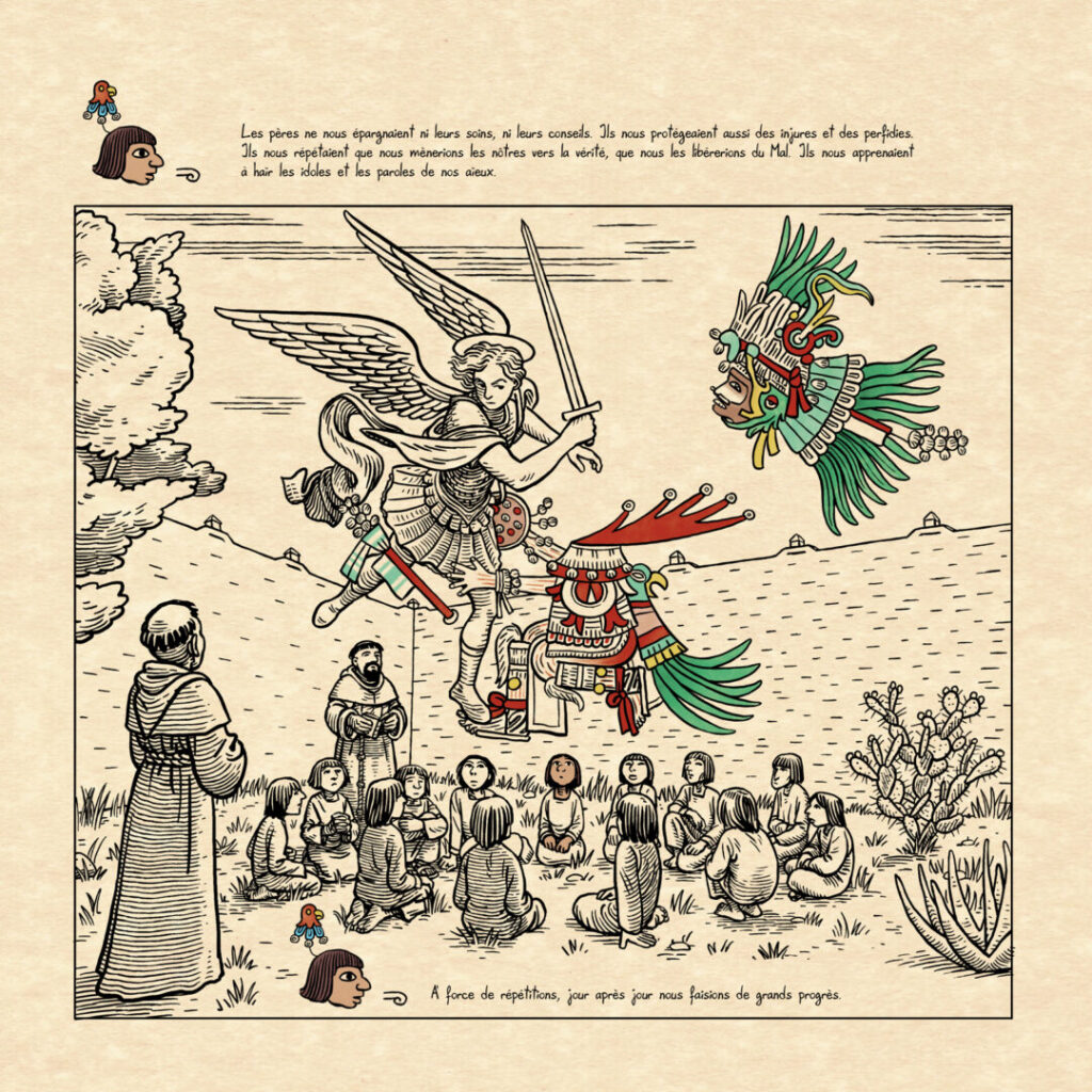 À travers les figures d’Antonio Valeriano et de Bernardino de Sahagún, l’album explore la tension complexe entre héritage culturel indigène et univers catholique imposé par la conquête espagnole. Romain Bertrand restitue avec finesse la dynamique du projet missionnaire, dévoilant les tensions au sein de l’ordre franciscain, les débats idéologiques autour de la conversion, le poids de la Couronne espagnole et le rôle ambigu des élites autochtones comme traducteurs et médiateurs. Le contexte intellectuel de cette Nouvelle-Espagne est aussi esquissé. Romain Bertrand, s’appuyant sur les travaux de Robert Ricard écrit justement :