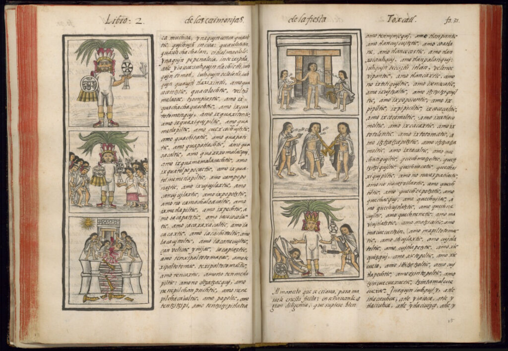 Finalement, Sahagún meurt en 1590, laissant derrière lui l’une des sources les plus complètes sur la civilisation mexica. Composé de 2446 pages, mêlant récits mythologiques, descriptions ethnographiques, philosophie morale et scènes du quotidien, le manuscrit est aussi décoré de 2500 pinturas. Il voyage à travers les siècles avant d’être redécouvert en 1793 à l’occasion de l’inventaire de la bibliothèque laurentienne de Florence … L’Histoire générale des choses de la Nouvelle-Espagne devient ainsi le Codex de Florence. Celui-ci constitue aujourd’hui l’une des archives les plus extraordinaires de la rencontre entre deux mondes.