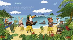 Ce petit livre sonore de 7 chansons permet aux tout-petits de découvrir des musiques de différents pays et d’en apprendre davantage sur les différentes cultures. Les animaux sont toujours habillés avec des tenues traditionnelles selon le lieu en question. Ils sont dans un paysage de ce territoire, ce qui permet à l’enfant de voir les différents paysages du monde en même que les monuments présents, les drapeaux, les animaux et la végétation…