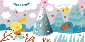 Les illustrations, toutes avec de la neige, sont colorées et attractives pour les petits qui découvrent une faune et une flore d’hiver : faon, biches, cerfs, oiseaux, sapins, lapins, écureuils, feuilles, souris… Parfois ces animaux sont habillés, ce qui permet de faire travailler le vocabulaire (manteaux, moufles, patins, écharpes…).