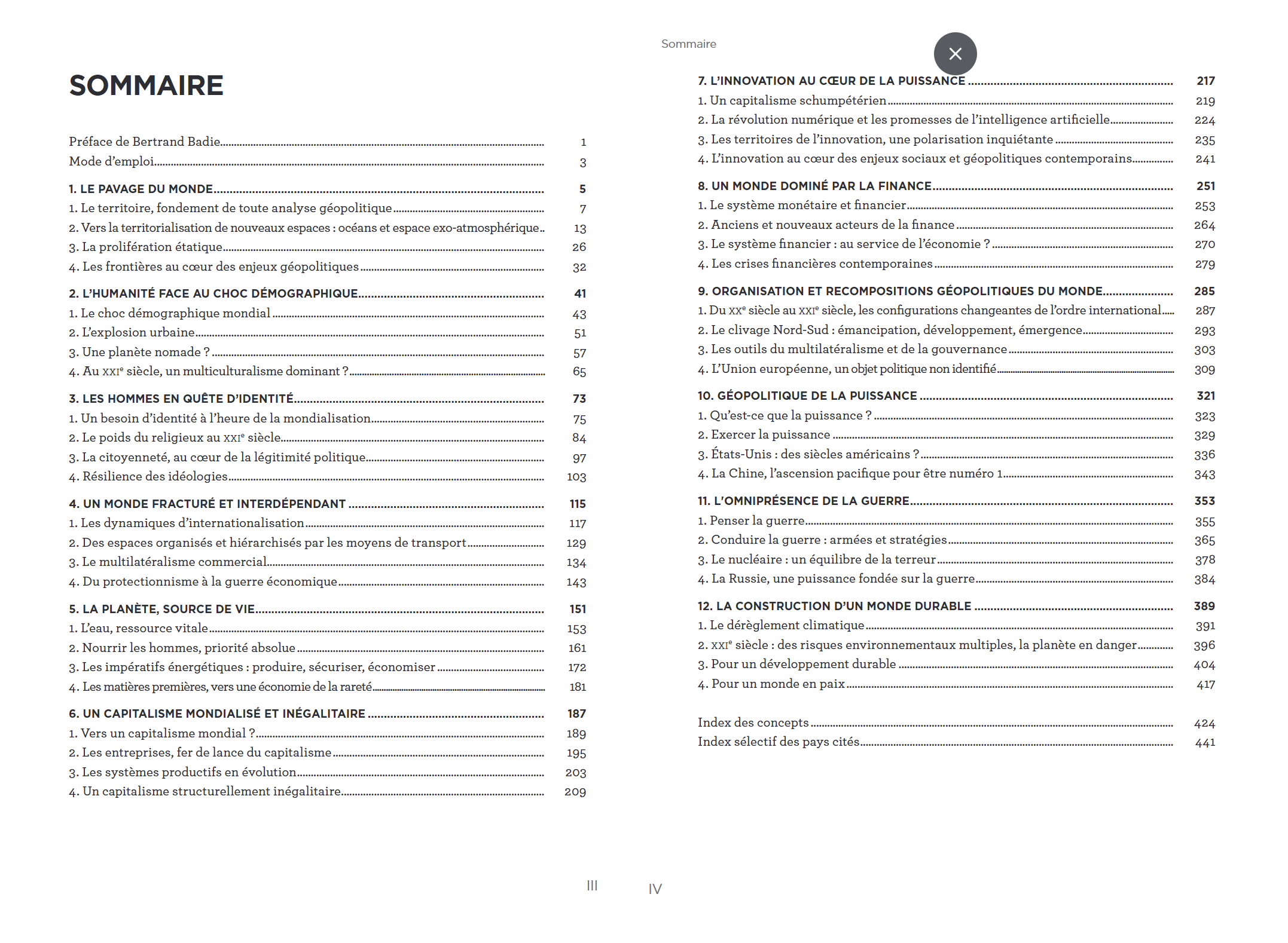 L’objectif de ce manuel de géopolitique, qui s’appuie sur les travaux de disciplines voisines (économie et géographie) est de présenter plus de 1000 notions et termes fréquemment mobilisés. Djihadisme, laogai, mix énergétique, commerce équitable, acculturation, capitalocène, polylatéralisme ou encore le new space sont définis dans un paragraphe de quelques lignes.